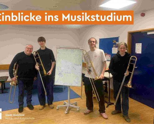 Am vorletzten Samstag nahmen Schüler der Musik- und Kunstschule Bielefeld gemeinsam mit ihrem Posaunenlehrer Stephan Schulze an einem Posaunen-Workshop an der Hochschule für Musik Detmold teil. Otmar Strobel leitete den Workshop und vermittelte den Teilnehmenden praxisnahe Einblicke in die Arbeit an einer Musikhochschule.