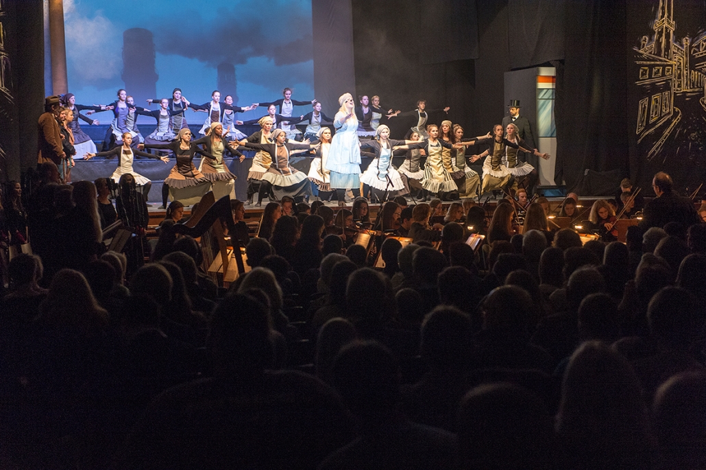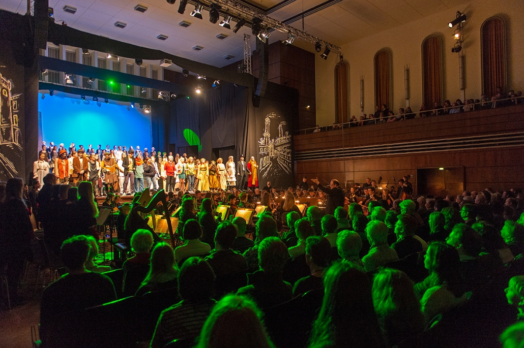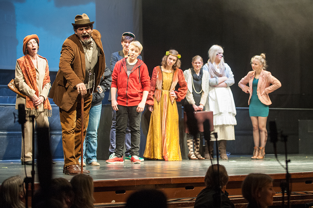 Wohlgelaunt und völlig angst- frei agierten die Musikschüler auf der Bühne der Oetkerhalle. Das Jubiläums-Musical „Ticket in die Vergangenheit” wurde am Ende gefeiert.